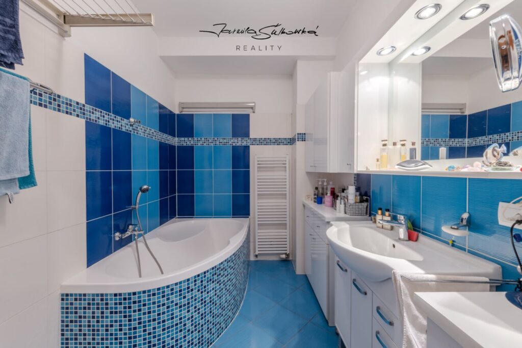 Koupelna je nadčasová a stále designově aktuální, bez nutnosti rekonstrukce.
